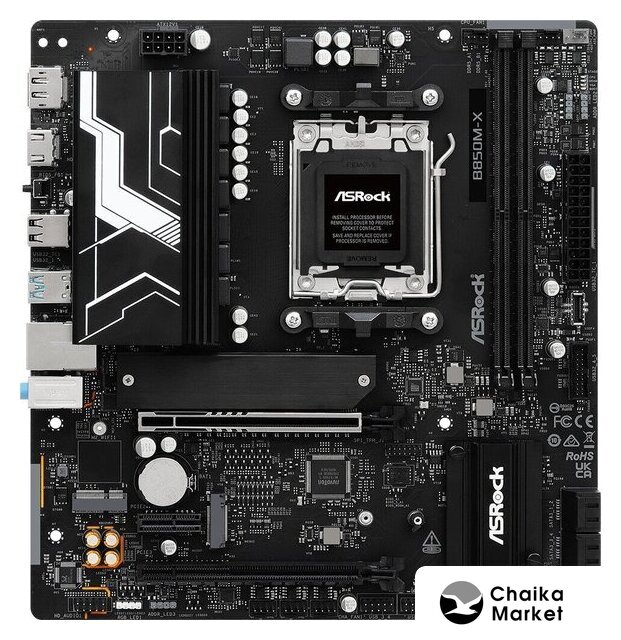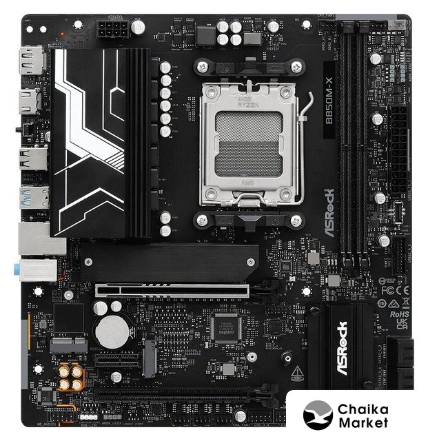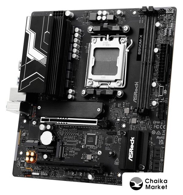 mATX, чипсет AMD B850, память 4xDDR5 до 8000 МГц, слоты: 2xPCIe x16 5.0, 3xM.2, 802.11ax (Wi-Fi 6E)+Bluetooth 5.3, 8+2+1 фаз питания