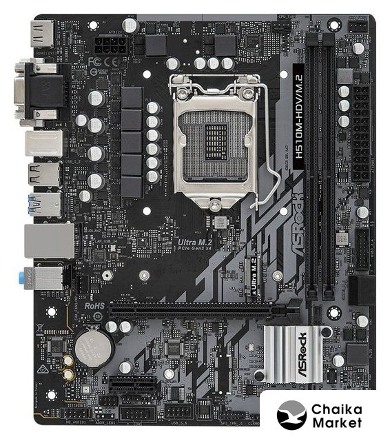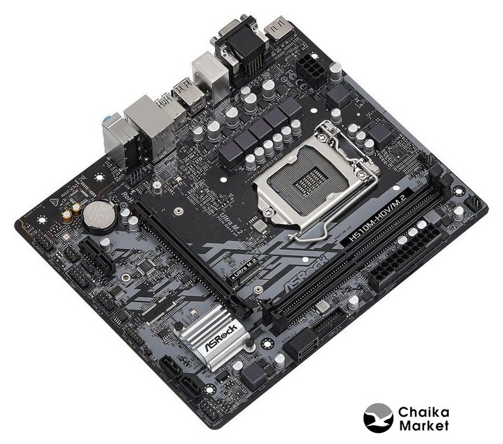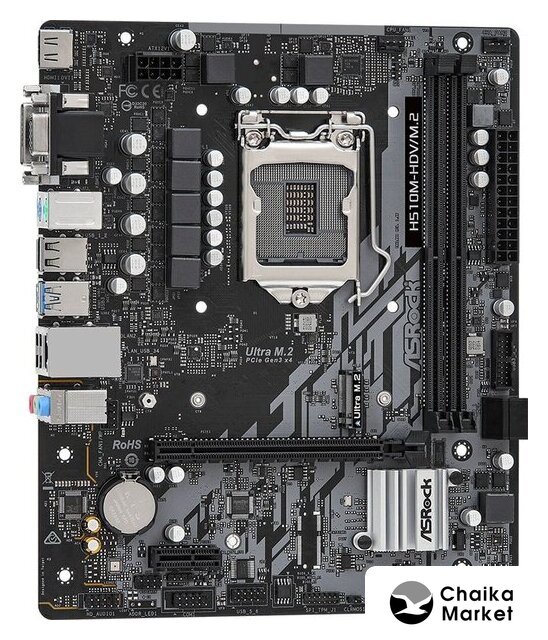 mATX, сокет Intel LGA1200, чипсет Intel H510, память 2xDDR4 до 3200 МГц, слоты: 1xPCIe x16 4.0, 1xPCIe x1, 1xM.2
