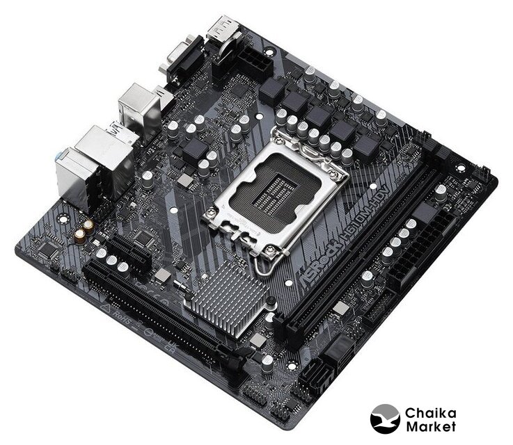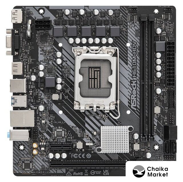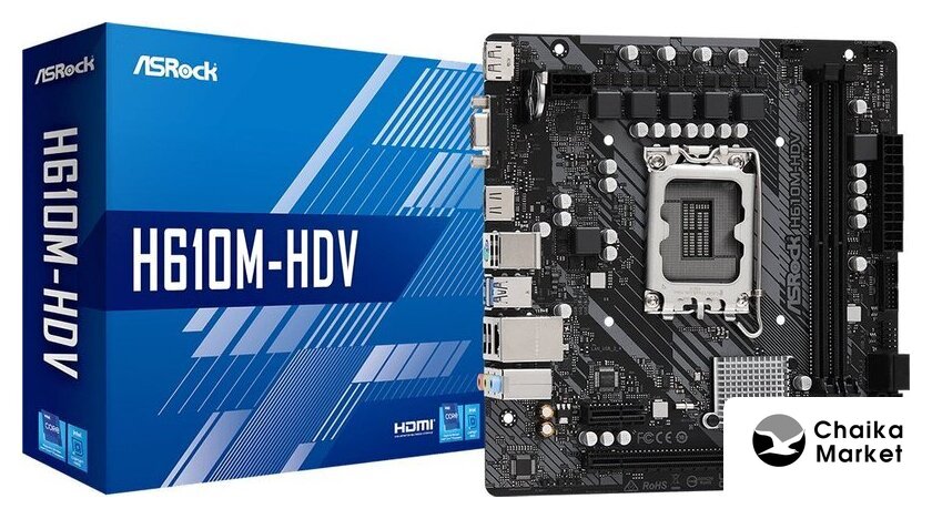 mATX, сокет Intel LGA1700, чипсет Intel H610, память 2xDDR4 до 3200 МГц, слоты: 1xPCIe x16 4.0, 1xPCIe x1, 1xM.2
