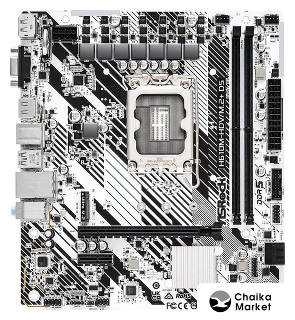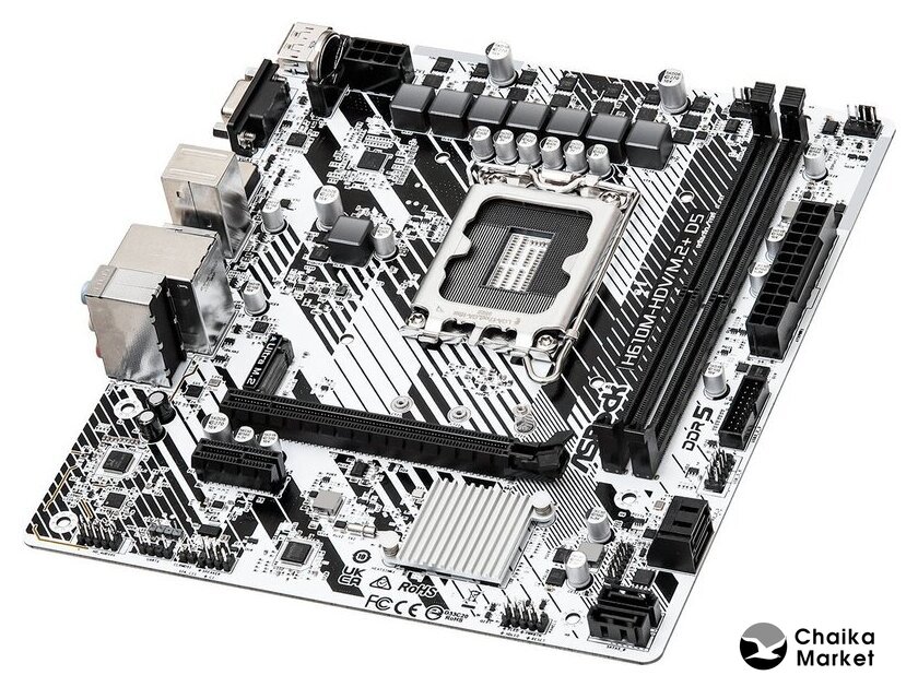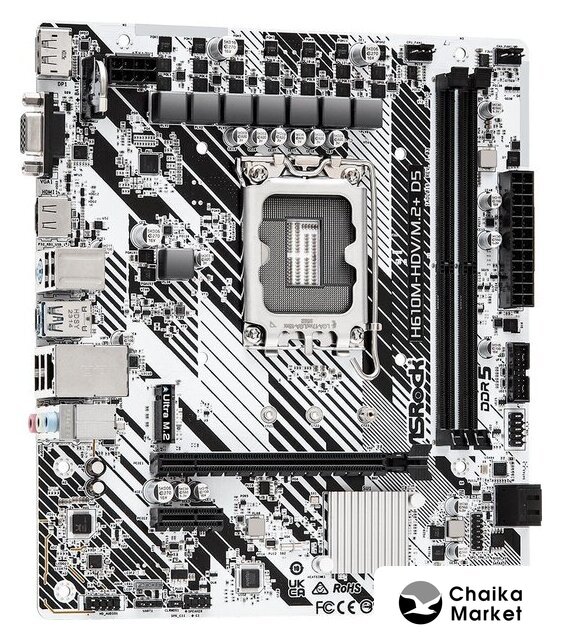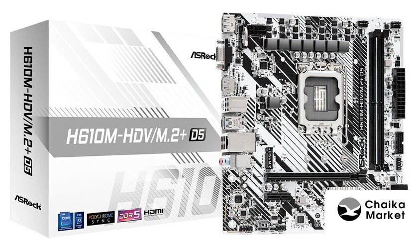 mATX, сокет Intel LGA1700, чипсет Intel H610, память 2xDDR5 до 5600 МГц, слоты: 1xPCIe x16 4.0, 1xPCIe x1, 1xM.2, 3+1+1 фаз питания
