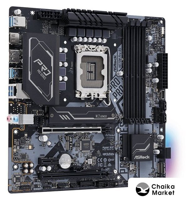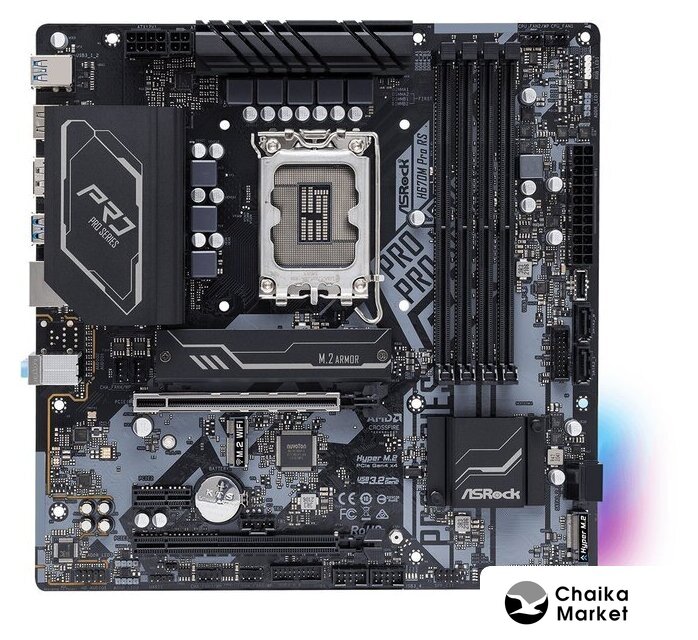 mATX, сокет Intel LGA1700, чипсет Intel B760, память 4xDDR4 до 5333 МГц, слоты: 1xPCIe x16 4.0, 1xPCIe x1, 2xM.2