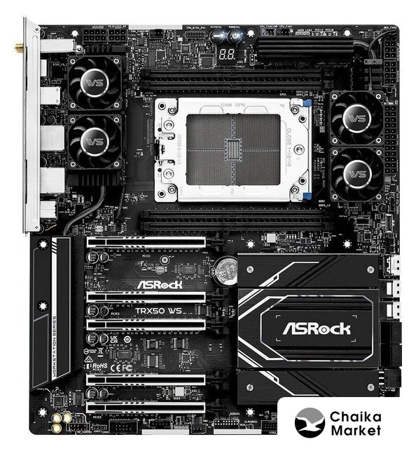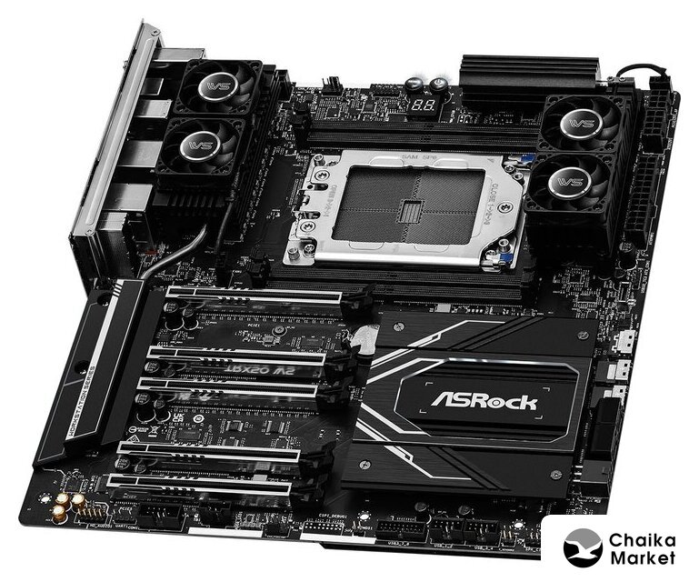 eATX, сокет AMD TR5, чипсет AMD TRX50, память 4xDDR5 до 7800 МГц, слоты: 3xPCIe x16 5.0, 4xM.2, 802.11be (Wi-Fi 7)+Bluetooth 5.3