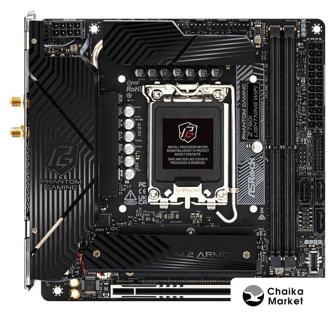 mATX, чипсет Intel B760, память 4xDDR5 до 7200 МГц, слоты: 2xPCIe x16 5.0, 1xPCIe x1, 3xM.2, 802.11ax (Wi-Fi 6)+Bluetooth 5.2, 12+1+1 фаз питания
