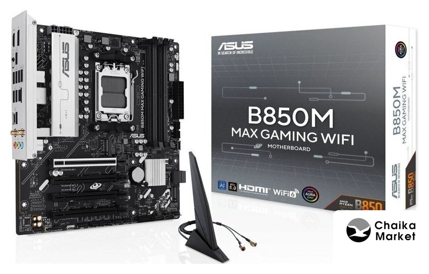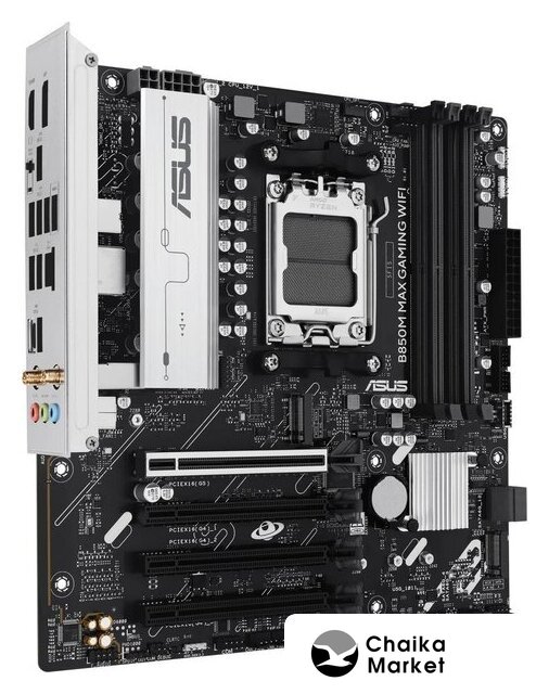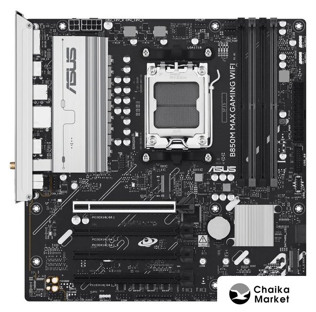 mATX, чипсет AMD B850, память 4xDDR5 до 8000 МГц, слоты: 1xPCIe x16 5.0, 1xPCIe x1, 3xM.2, 802.11ax (Wi-Fi 6E)+Bluetooth 5.3, 8+2+1 фаз питания