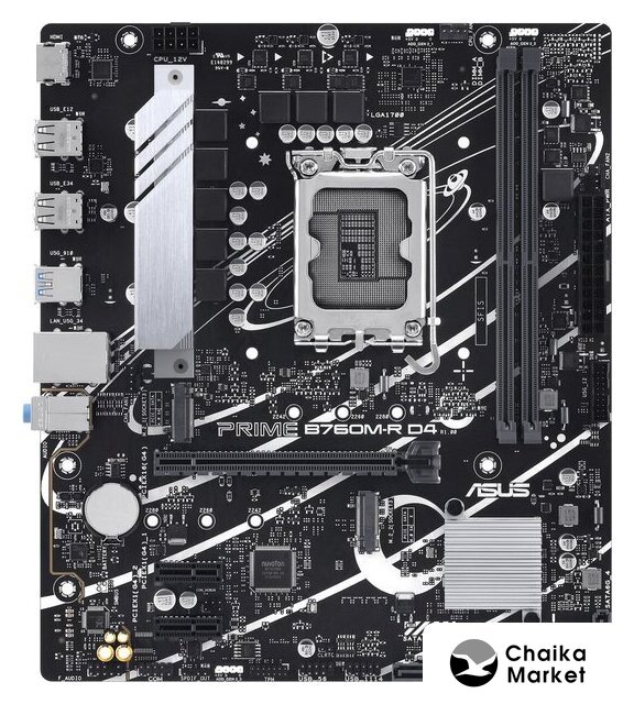 mATX, сокет Intel LGA1700, чипсет Intel B760, память 4xDDR4 до 5333 МГц, слоты: 1xPCIe x16 4.0, 1xPCIe x1, 2xM.2