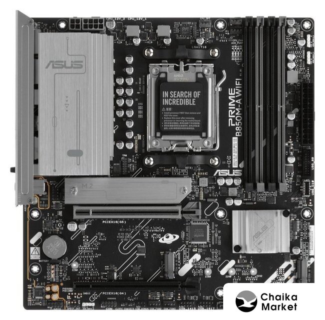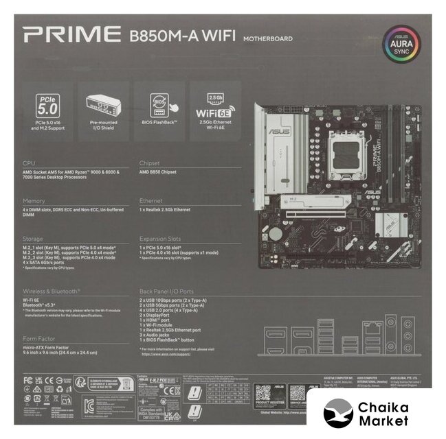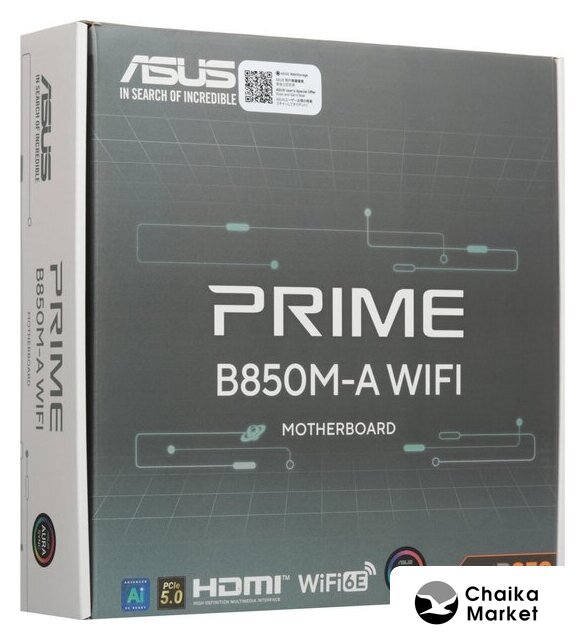 mATX, сокет AMD AM5, чипсет AMD B850, память 4xDDR5 до 8200 МГц, слоты: 2xPCIe x16 5.0, 2xM.2, 802.11ax (Wi-Fi 6E)+Bluetooth 5.3, 12+2+2 фаз питания