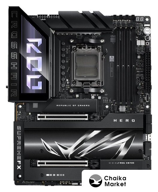 eATX, сокет AMD AM5, чипсет AMD X670E, память 4xDDR5 до 7800 МГц, слоты: 2xPCIe x16 5.0, 4xM.2, 24+2+1 фаз питания