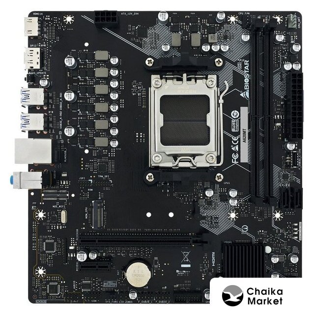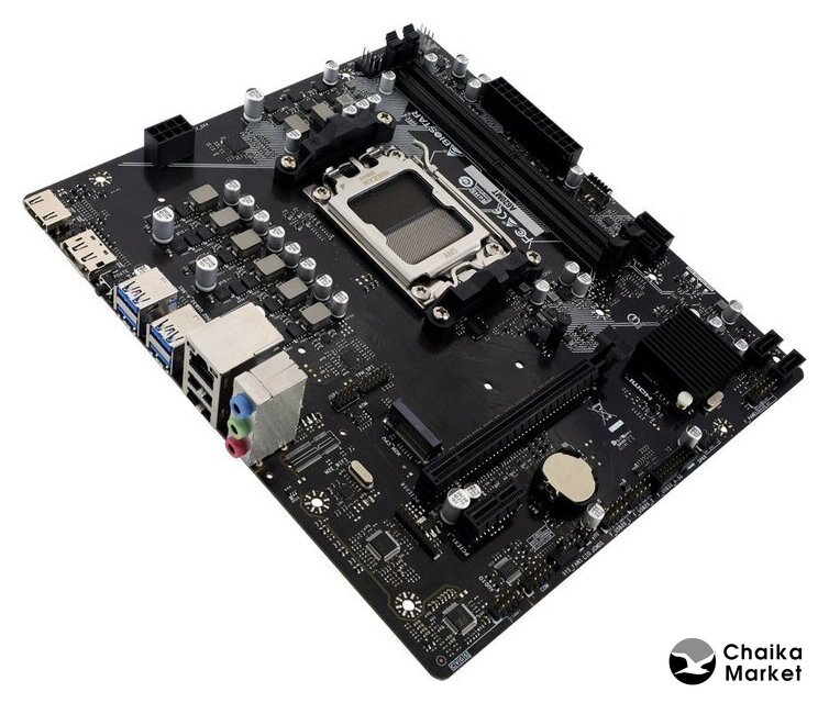 mATX, чипсет AMD A620, память 2xDDR5 до 6800 МГц, слоты: 1xPCIe x16 4.0, 1xPCIe x1, 1xM.2, 2+1+1 фаз питания