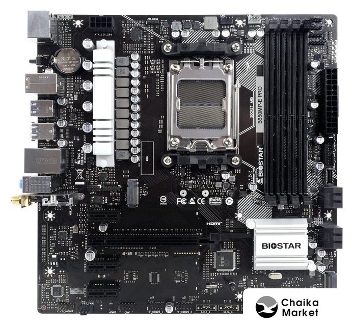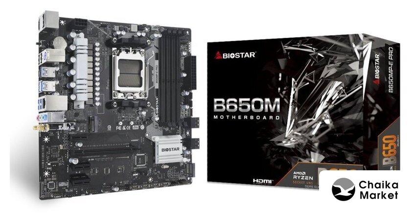 mATX, сокет AMD AM5, чипсет AMD B650, память 2xDDR5 до 6400 МГц, слоты: 1xPCIe x16 4.0, 2xPCIe x1, 2xM.2, 6+1+1 фаз питания