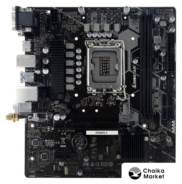 mATX, сокет Intel LGA1700, чипсет Intel B760, память 4xDDR4 до 5333 МГц, слоты: 1xPCIe x16 4.0, 2xPCIe x1, 2xM.2, 6+2+1 фаз питания