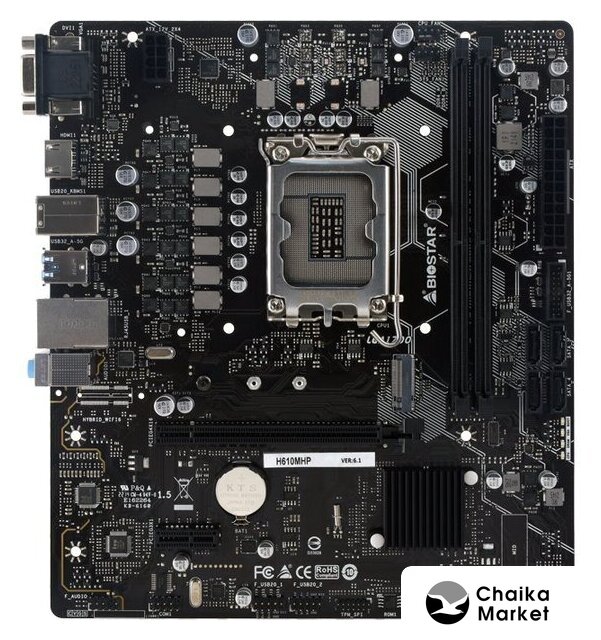 mATX, сокет Intel LGA1700, чипсет Intel H610, память 2xDDR4 до 3200 МГц, слоты: 1xPCIe x16 4.0, 1xPCIe x1, 1xM.2