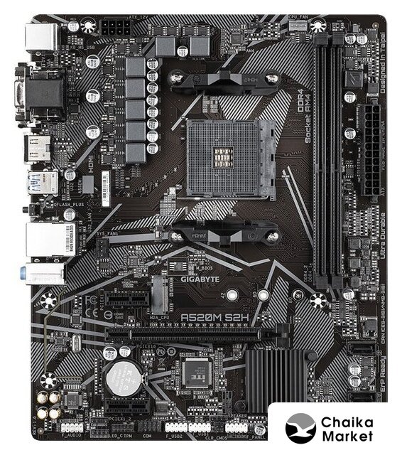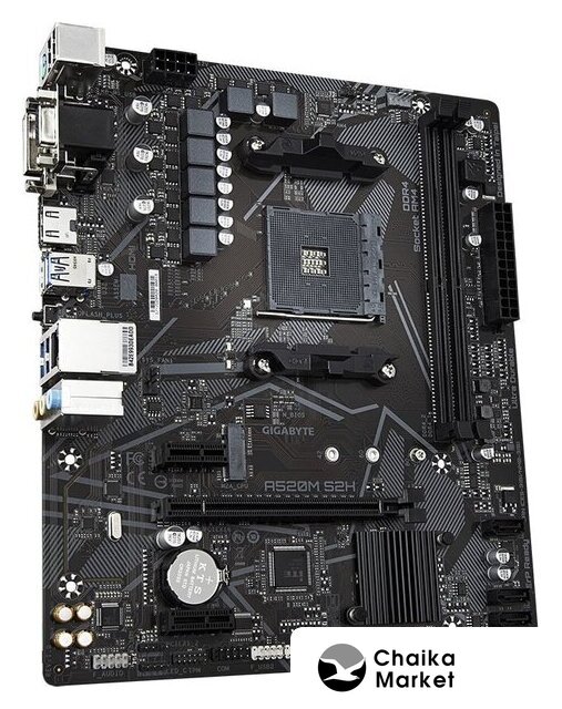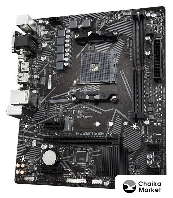 mATX, сокет AMD AM4, чипсет AMD A520, память 2xDDR4 до 4933 МГц, слоты: 1xPCIe x16, 2xPCIe x1, 1xM.2