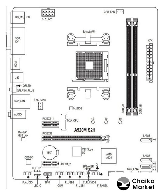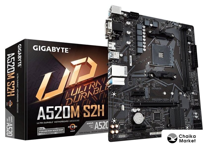mATX, сокет AMD AM4, чипсет AMD A520, память 2xDDR4 до 5100 МГц, слоты: 1xPCIe x16 3.0, 1xPCIe x1, 1xM.2