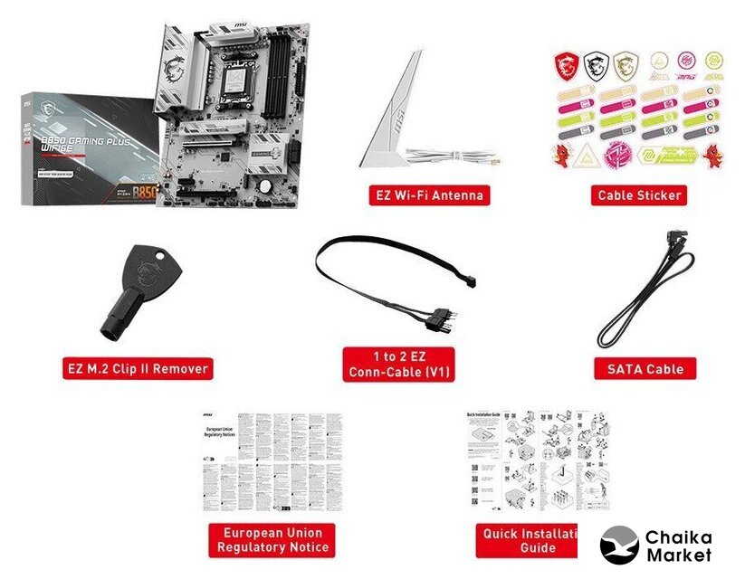 Комплектация | - кабель SATA - Wi-Fi антенна - 1-2 EZ кабель - набор стикеров- EZ M.2 Clip II экстрактор- документация |