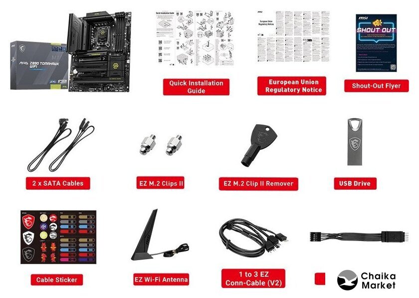 | Комплектация | - EZ Wi-Fi антенна - USB Flash накопитель - стикеры для кабелей- 2 кабеля SATA- EZ кабель фронтальной панели- 1EZ - 3EZ кабель - ключ-экстрактор EZ M.2 Clip II - 2 винта со стойкой EZ M.2 Clip II- документация |