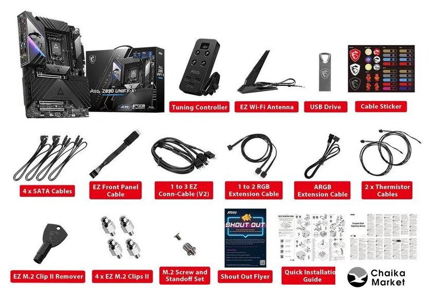 Комплектация | - MEG Tuning контроллер - EZ Wi-Fi антенна - USB Flash накопитель - стикеры для кабелей- 4 кабеля SATA- EZ кабель фронтальной панели- 1EZ - 3EZ кабель - 1RGB - 2RGB кабель-удлинитель - ARGB кабель-удлинитель- 2 кабеля термистора - ключ-экстрактор EZ M.2 Clip II - монтажный комплект для M.2- документация |