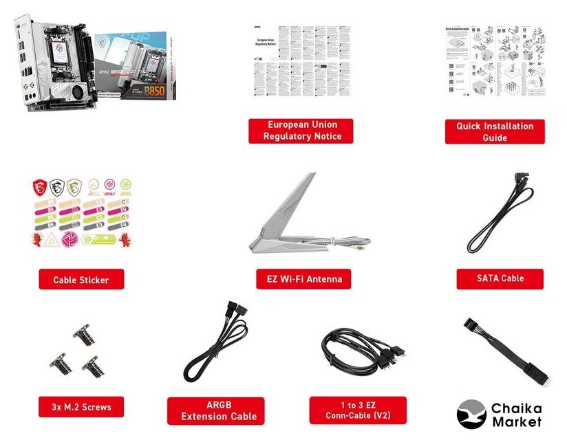 | Комплектация | - кабель SATA - EZ Wi-Fi антенна - 3 винта EZ M.2 Clip II- 1-3 EZ кабель - ARGB кабель- EZ кабель передней панели- документация |