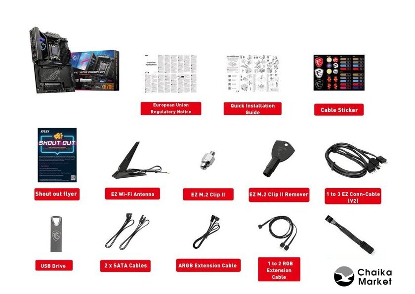 Комплектация | Board• 1x MotherboardDocumentation• 1x Quick installation guide• 1x European Union Regulatory NoticesApplication• 1x USB driveCables• 2x SATA 6Gb/s cables• 1x 1 to 2 RGB extension cable• 1x ARGB extension cable• 1x 1 to 3 EZ Conn-Cable (V2)• 1x EZ Front panel cableAccessories• 1x EZ Wi-Fi Antenna• 1x Cable sticker• 1x EZ M.2 Clip II• 1x EZ M.2 Clip II Remover |