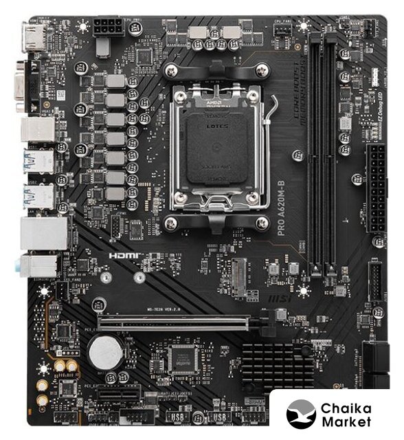 mATX, сокет AMD AM5, чипсет AMD A620, память 2xDDR5 до 6800 МГц, слоты: 1xPCIe x16 4.0, 1xPCIe x1, 1xM.2
