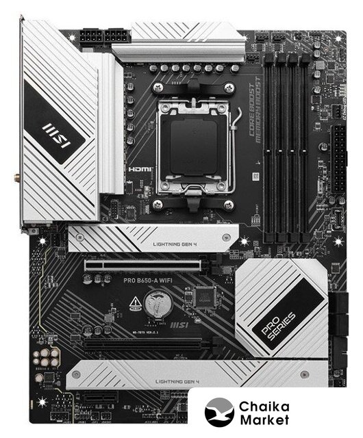 mATX, сокет AMD AM5, чипсет AMD B650, память 4xDDR5 до 7200 МГц, слоты: 2xPCIe x16 4.0, 2xPCIe x1, 2xM.2, 12+2+1 фаз питания