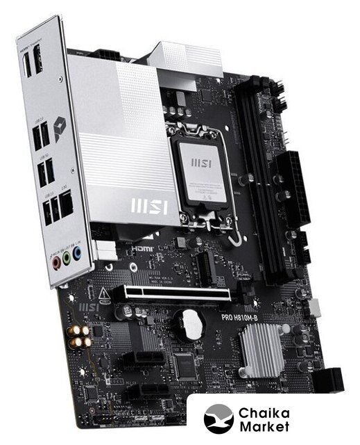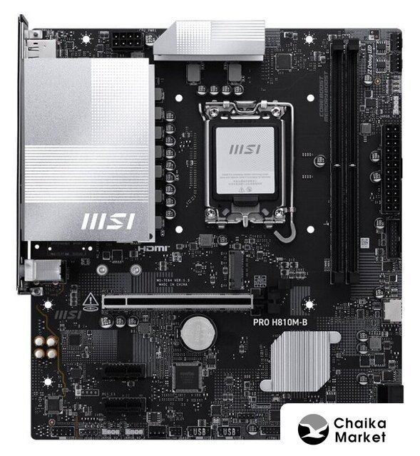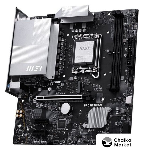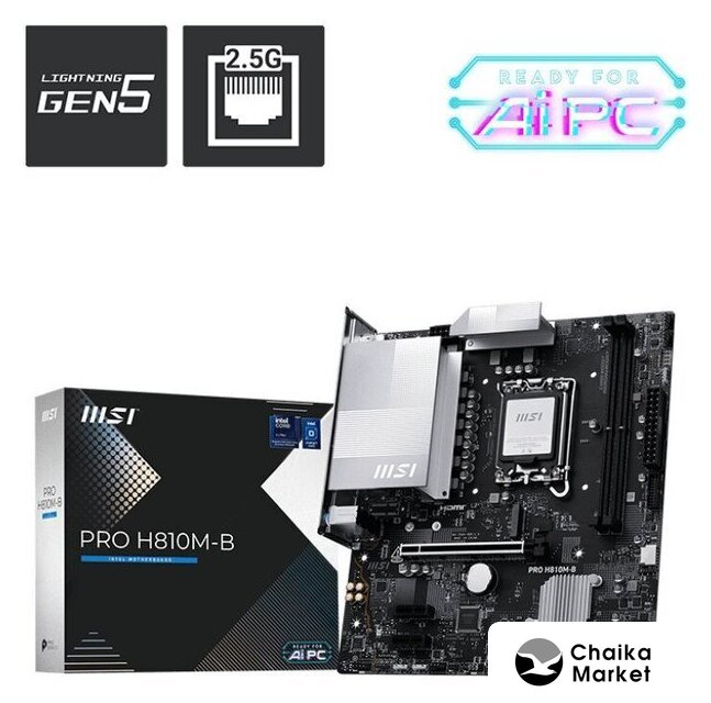 mATX, чипсет Intel H810, память 2xDDR5 до 6400 МГц, слоты: 1xPCIe x16 4.0, 1xPCIe x1, 1xM.2, 3+1+2 фаз питания