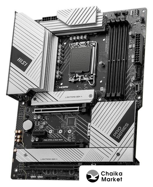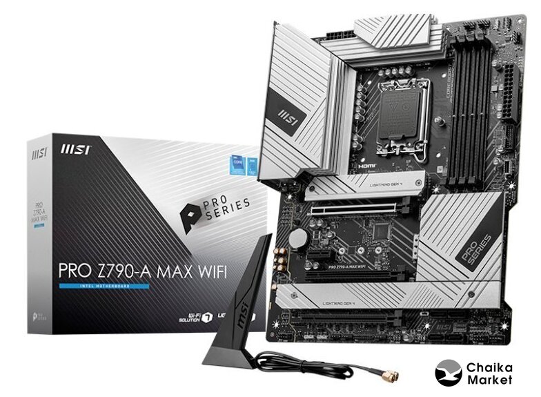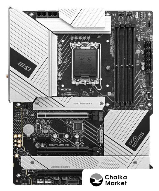 ATX, сокет Intel LGA1700, чипсет Intel B760, память 4xDDR4 до 5333 МГц, слоты: 2xPCIe x16 5.0, 2xPCIe x1, 3xM.2, 802.11ax (Wi-Fi 6)+Bluetooth 5.2