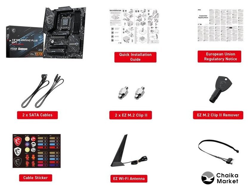 Комплектация | - два кабеля SATA- 2 винта EZ M.2 Clip II- EZ M.2 Clip II экстрактор- набор стикеров- EZ Wi-Fi антенна - 1-2 EZ кабель - документация |