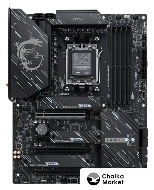 ATX, чипсет AMD B850, память 4xDDR5/DDR5 CUDIMM до 8200 МГц, слоты: 4xPCIe x16 5.0, 3xM.2, 802.11be (Wi-Fi 7)+Bluetooth 5.4, 12+2+1 фаз питания