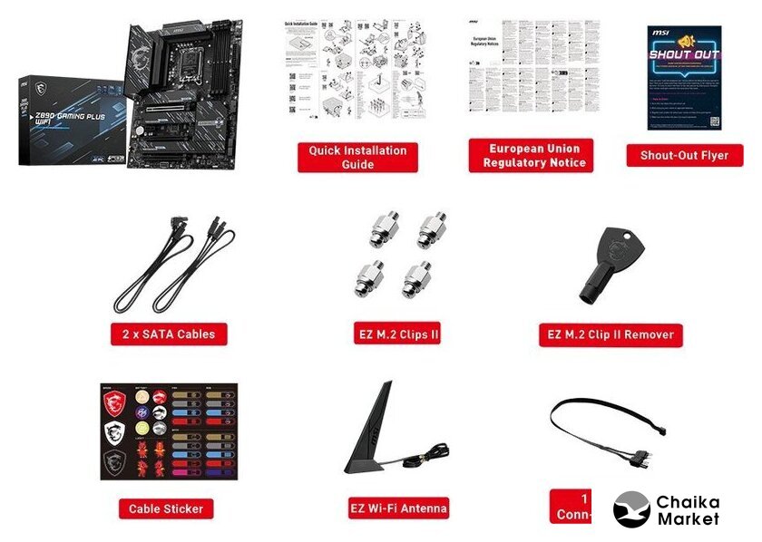 | Комплектация | - EZ Wi-Fi антенна - стикеры для кабелей- 2 кабеля SATA- 1EZ - 2EZ кабель - ключ-экстрактор EZ M.2 Clip II - 4 винта со стойкой EZ M.2 Clip II- документация |