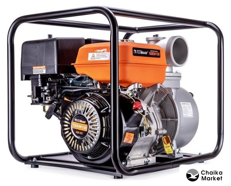 для чистой воды, бензиновый двигатель, мощность 6.3 кВт, производительность 1600 л/мин, высота подъема 30 м, бак 6.5 л, патрубки 100/100 мм