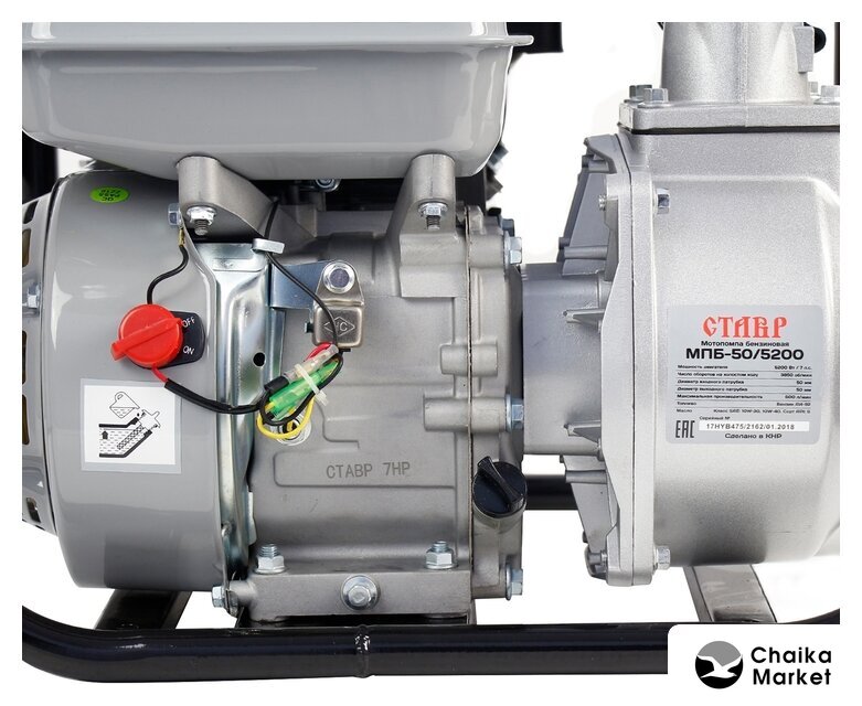 для слабозагрязненной воды, бензиновый двигатель, мощность 4.05 кВт, производительность 600 л/ч, высота подъема 30 м, бак 3.5 л, патрубки 50/50 мм