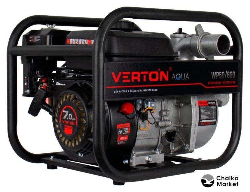 для слабозагрязненной воды, бензиновый двигатель, мощность 5.2 кВт, производительность 500 л/мин, высота подъема 30 м, бак 3.6 л, патрубки 50/50 мм