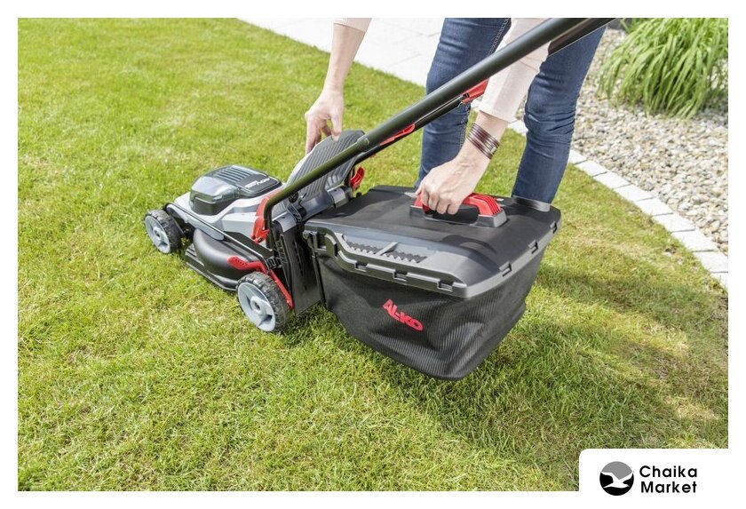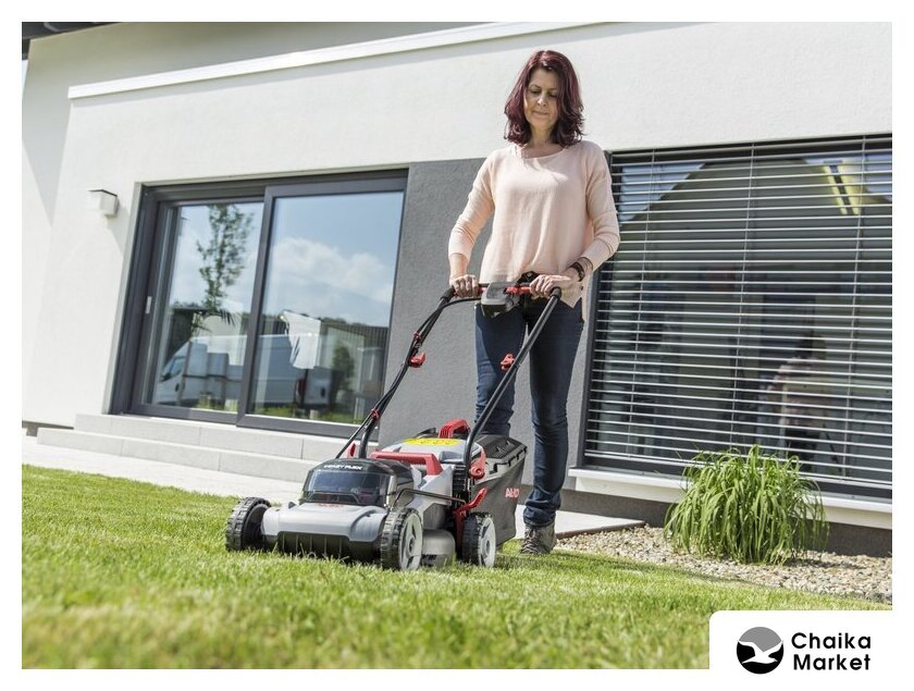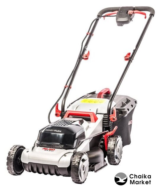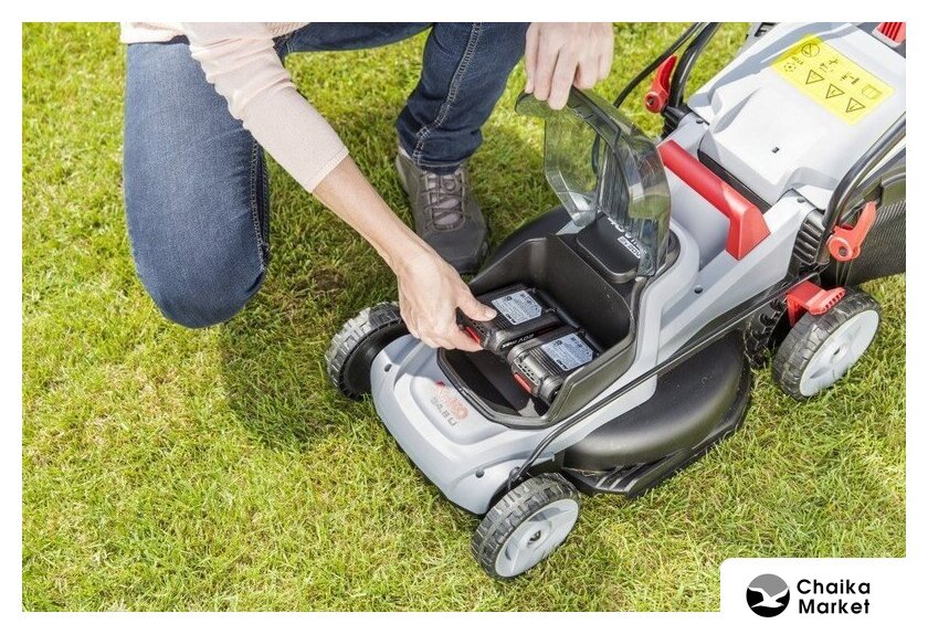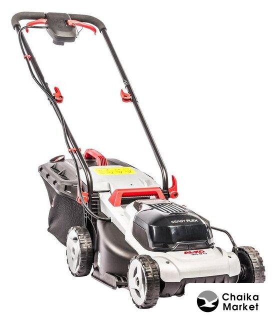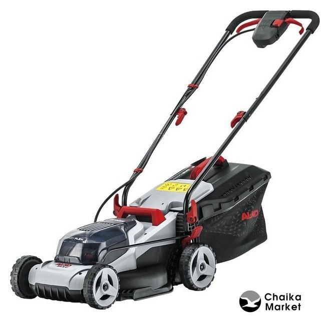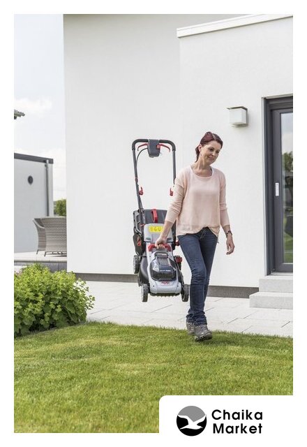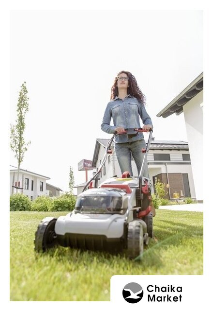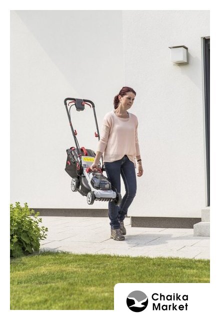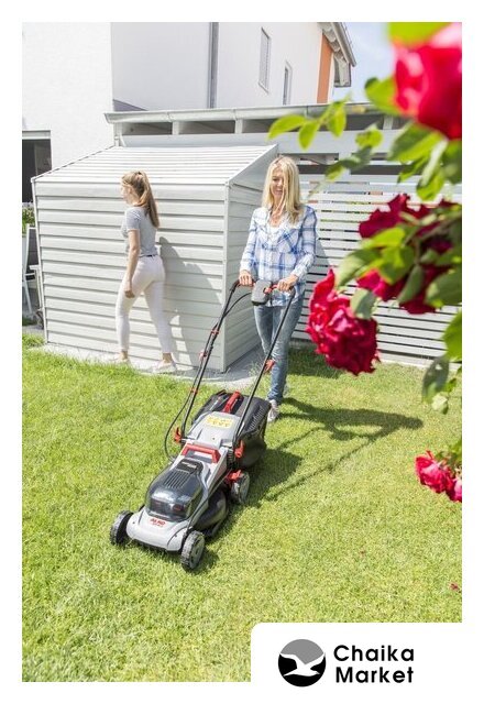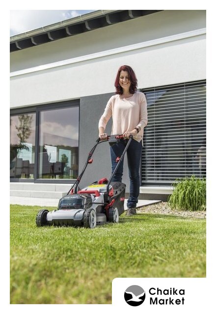 роторная газонокосилка, аккумуляторный двигатель, работа от аккумулятора, ширина скашивания: 43 см, жесткий травосборник 63 л