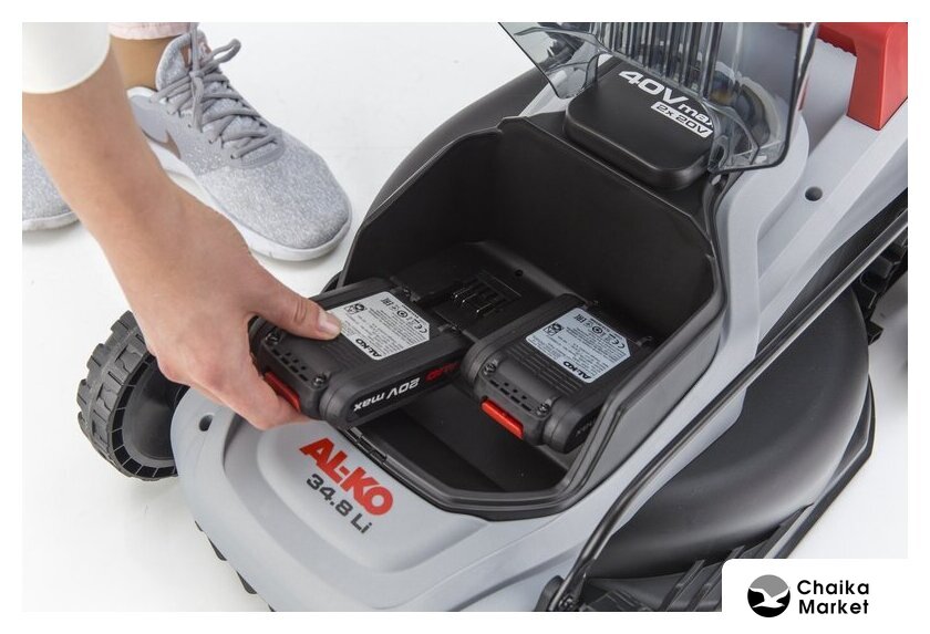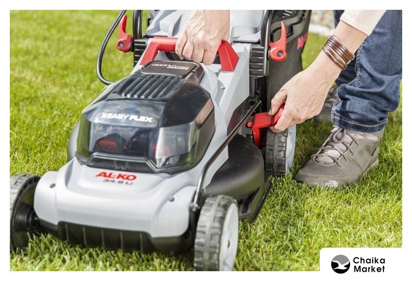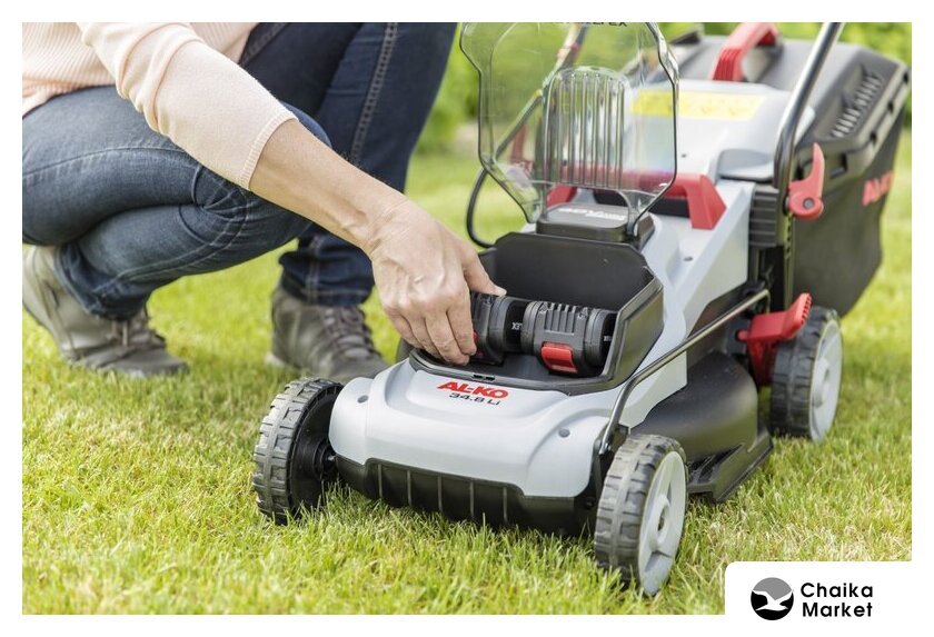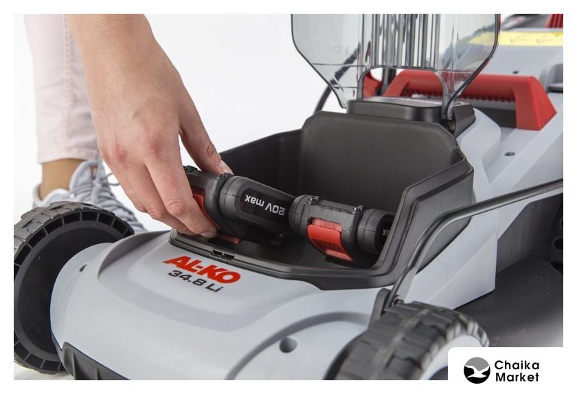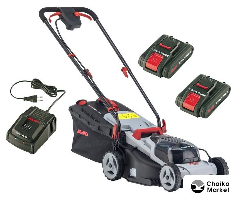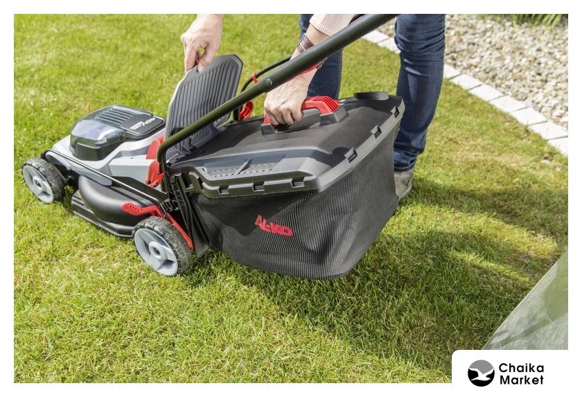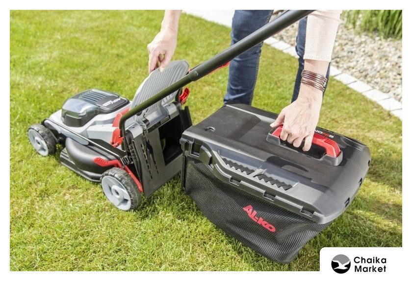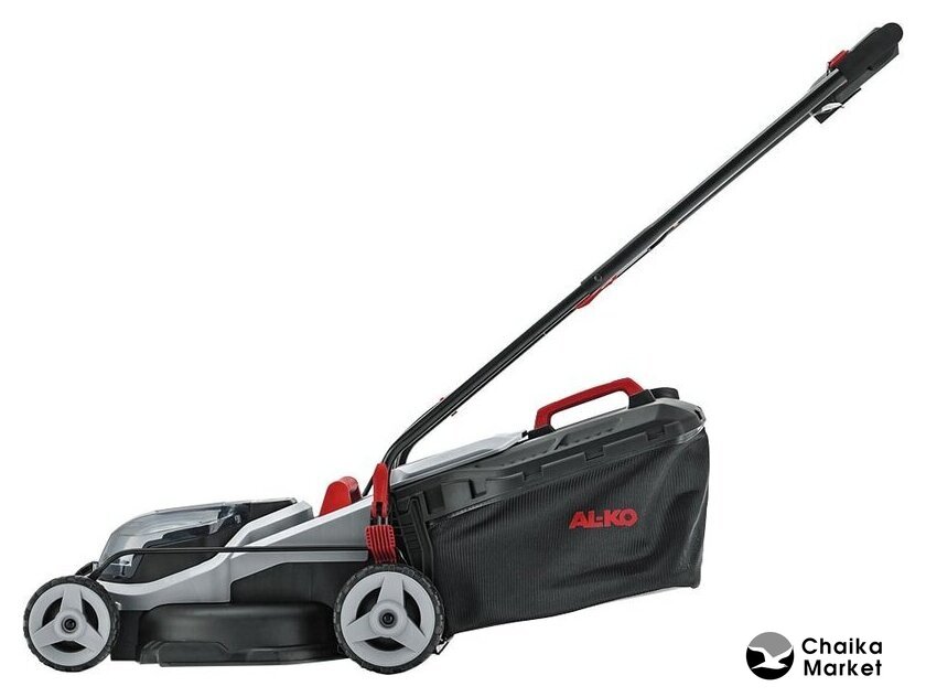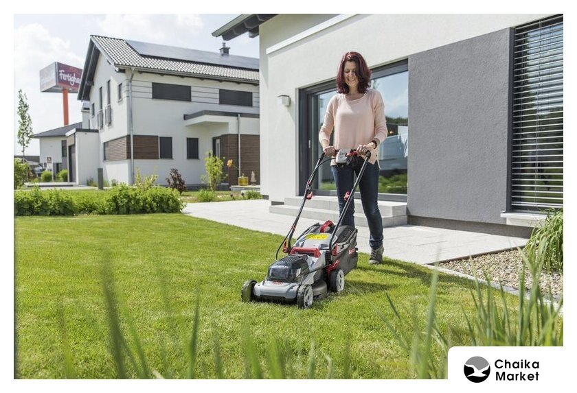 роторная газонокосилка, аккумуляторный двигатель, работа от аккумулятора, ширина скашивания: 43 см, жесткий травосборник 63 л