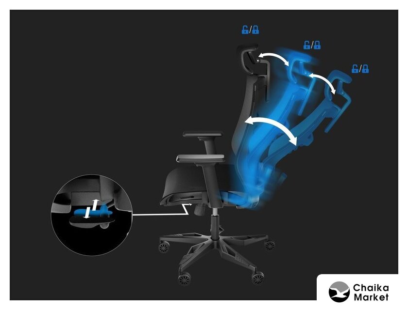 игровое (геймерское) кресло, механизм DMS (Топ-Ган, Tilt), максимальная нагрузка 150 кг, ширина кресла 70 см