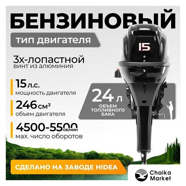 бензиновый 2-тактный, 11000 Вт, 15 л.с., 246 см³, бак 24 л, пуск: ручной, высота транца: 381 мм