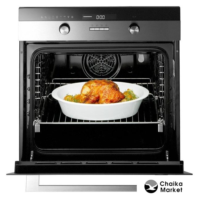 электрический с конвекцией, приготовление на пару, объем 77 л, утапливаемые переключатели, 11 режимов, очистка каталитическая + паровая, 2 стекла в дверце, направляющие проволочные + телескопические (2 уровня), термощуп