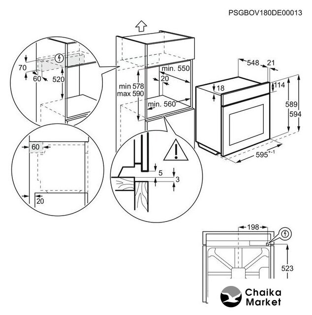 электрический с конвекцией, объем 66 л, утапливаемые переключатели, 8 режимов, очистка ручная, 3 стекла в дверце, направляющие проволочные