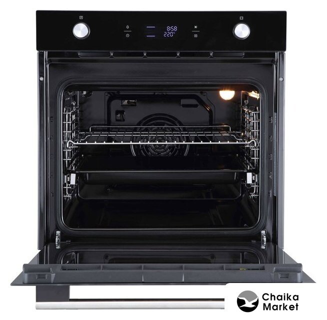 электрический с конвекцией, объем 60 л, утапливаемые переключатели, 6 режимов, очистка паровая, 3 стекла в дверце, направляющие проволочные