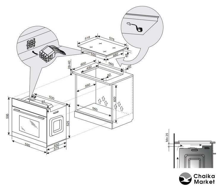 электрический с конвекцией, объем 60 л, 6 режимов, очистка паровая, 3 стекла в дверце, направляющие рельефные