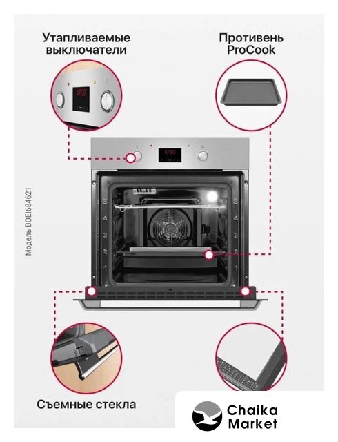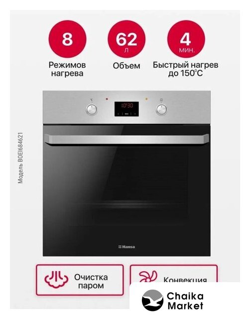 электрический с конвекцией, объем 64 л, 4 режима, очистка ручная, 2 стекла в дверце, направляющие проволочные