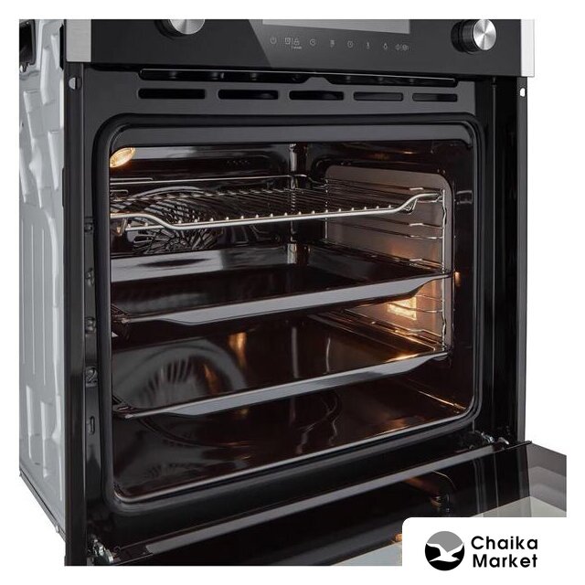 электрический с конвекцией, приготовление на пару, объем 77 л, 11 режимов, очистка пиролитическая + паровая, 2 стекла в дверце, направляющие проволочные