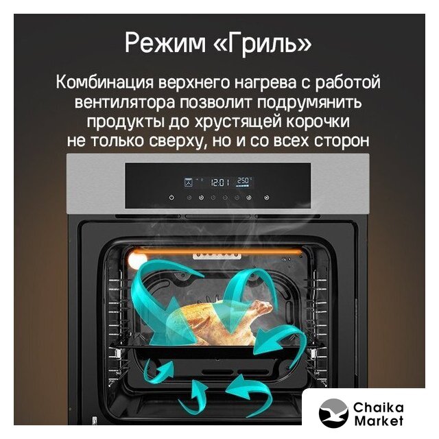 электрический с конвекцией, объем 60 л, 10 режимов, очистка паровая, 3 стекла в дверце, направляющие проволочные