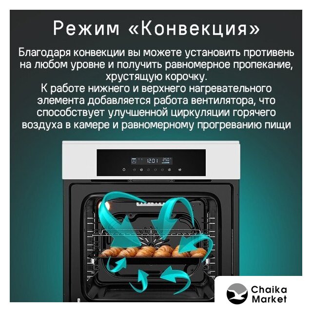 электрический с конвекцией, объем 68 л, 6 режимов, очистка ручная, энергопотребление A+