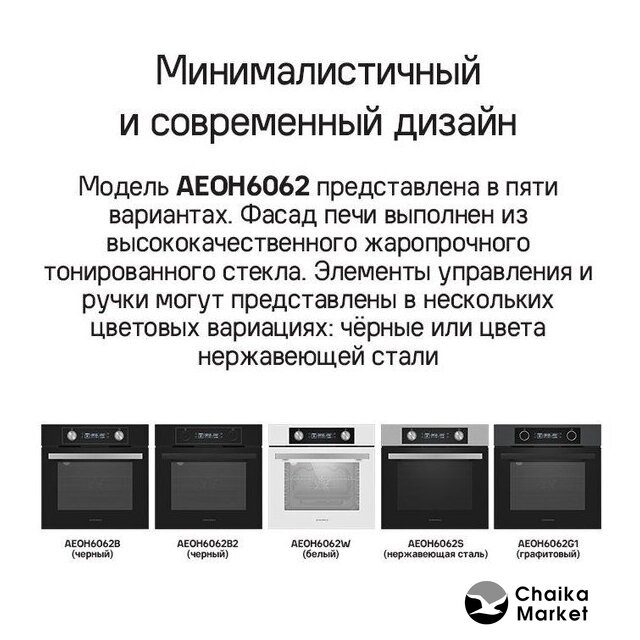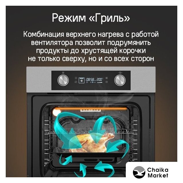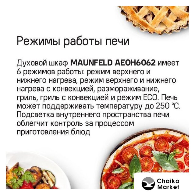 | Режимы работы | двухсторонний нагрев, гриль + конвекция, нижний нагрев + конвекция, двухсторонний нагрев + конвекция, размораживание |