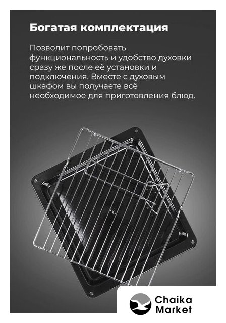 электрический с конвекцией, объем 49 л, утапливаемые переключатели, 9 режимов, очистка паровая, 2 стекла в дверце, направляющие проволочные