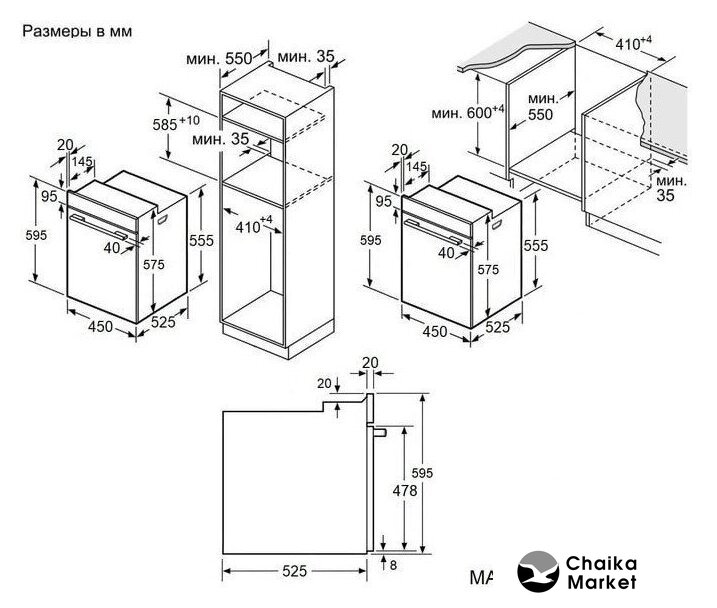 электрический с конвекцией, объем 68 л, утапливаемые переключатели, 8 режимов, очистка ручная, 3 стекла в дверце, направляющие проволочные + телескопические (1 уровень)
