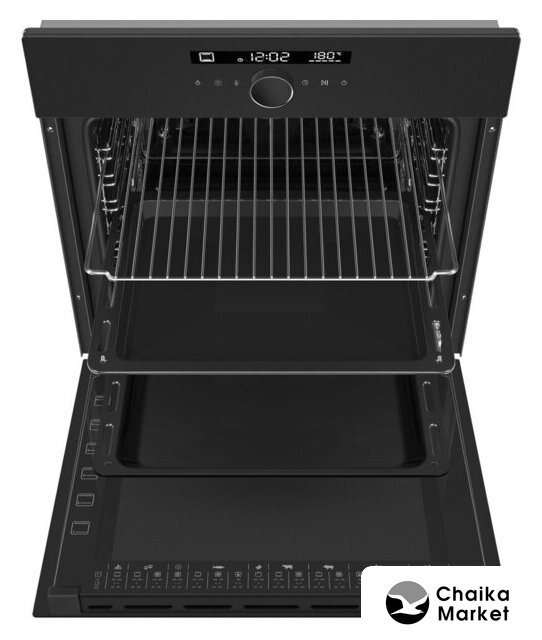 электрический с конвекцией, объем 77 л, утапливаемые переключатели, 11 режимов, очистка каталитическая + паровая, 2 стекла в дверце, направляющие проволочные