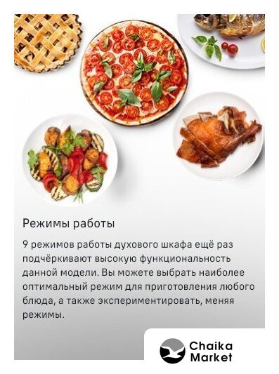 Режимы работы | нижний нагрев, двухсторонний нагрев, большой гриль, вентиляционный нагрев, гриль + конвекция, двухсторонний нагрев + конвекция, размораживание |