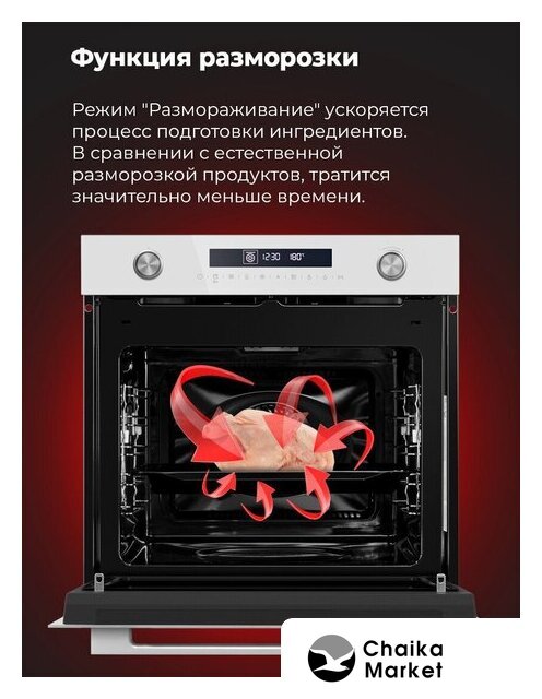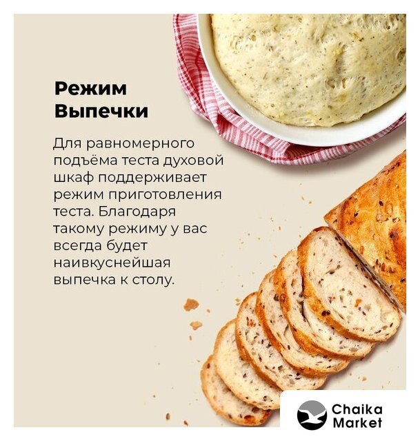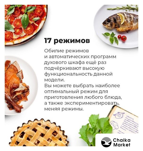 Режимы работы | нижний нагрев, двухсторонний нагрев, большой гриль, гриль + конвекция, нижний нагрев + конвекция, двухсторонний нагрев + конвекция, размораживание, предварительный разогрев духовки, подготовка теста |